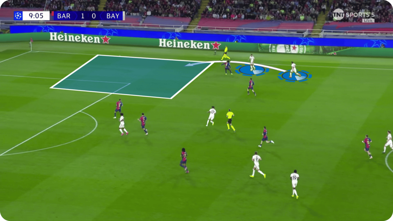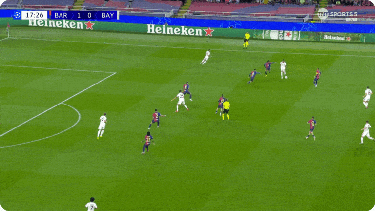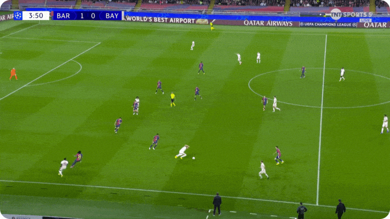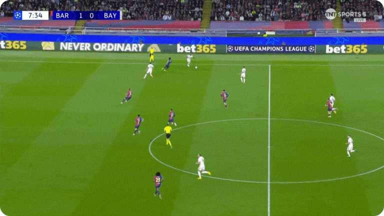 Bayern remained unfazed by the early setback and continued with their high pressing. Notably, Barcelona also attempted to defend high up the pitch, using a consistent offside trap to disrupt Bayern's attacks. However, Bayern adapted well, deliberately looking for gaps behind Barcelona's defensive line. They frequently attempted penetrating passes, which put significant pressure on the Barcelona defense, particularly along the flanks. With the wide positioning of wingers Raphinha and Yamal, Bayern was able to create overload situations on the sides—a weakness that the Catalans struggled to fully address.