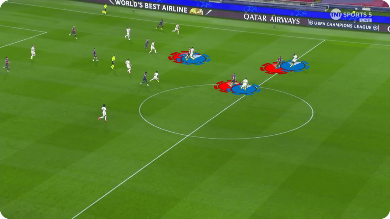 Scene 3: Bayern consistently exploits their numerical superiority on the flanks. Barcelona's defenders are forced to contend with two attackers, while Barcelona's midfielders often have to cover long distances due to the high positioning of Bayern's wingers.