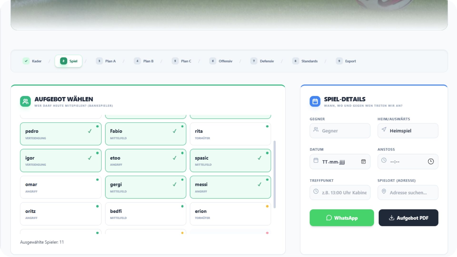Ersatzspieler auswählen, Spielinfos ergänzen und das Aufgebot direkt als PDF oder per WhatsApp an die Mannschaft schicken.